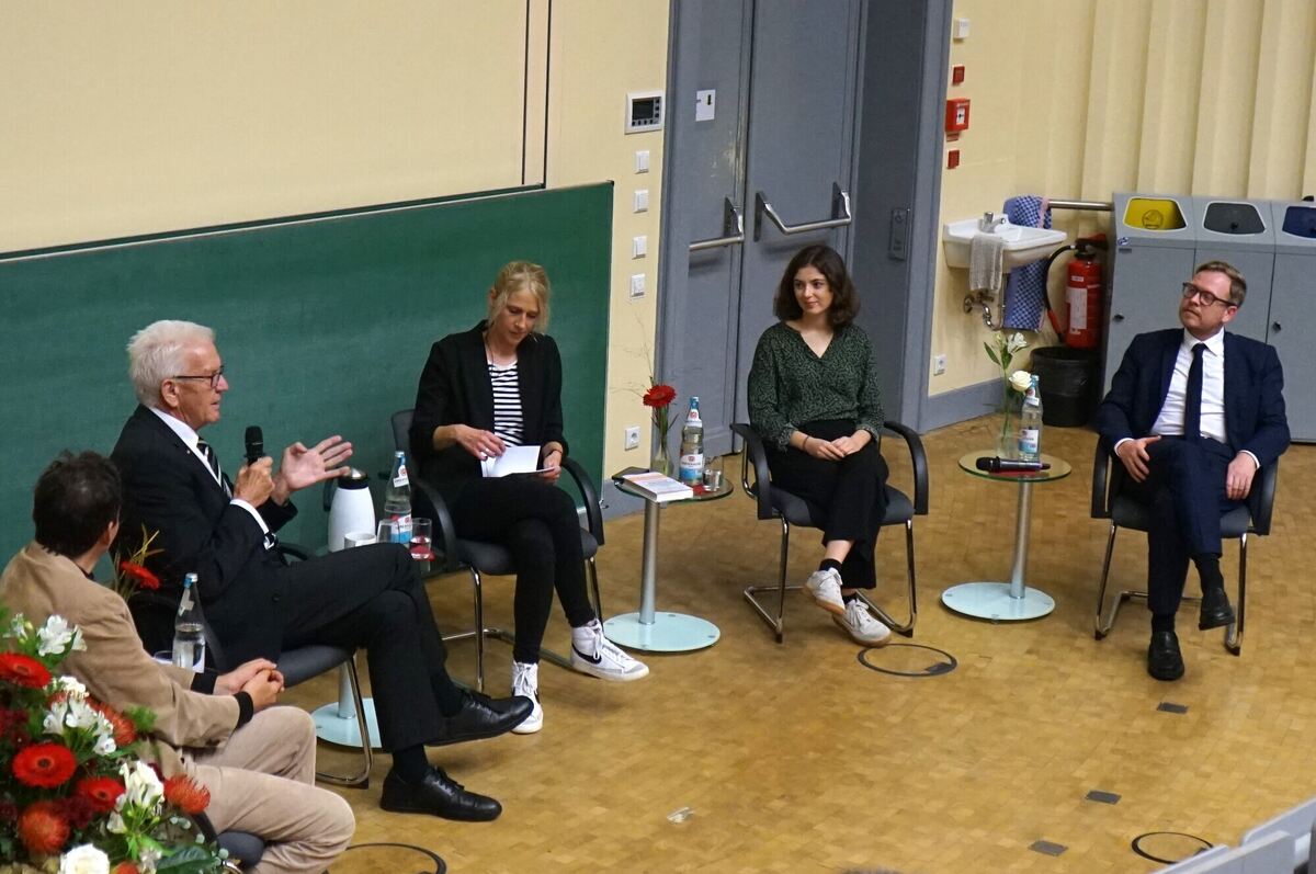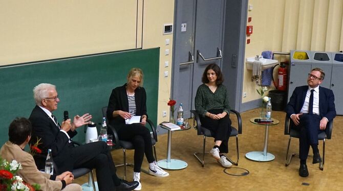 Ministerpräsident Winfried Kretschmann diskutiert mit (von links) Wissenschaftler Philipp Krohn, Moderatorin Kara Ballarin, Klimaaktivistin Clara Schweizer und Wissenschaftler Markus Griebel über den Klimawandel. FOTO: STRAUB