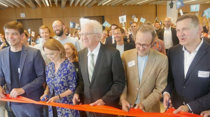 Ministerpräsident Winfried Kretschmann (Mitte) kam zur offiziellen Eröffnung des Tübinger AI Centers auf den MPI-Campus. FOTO: LEISTER