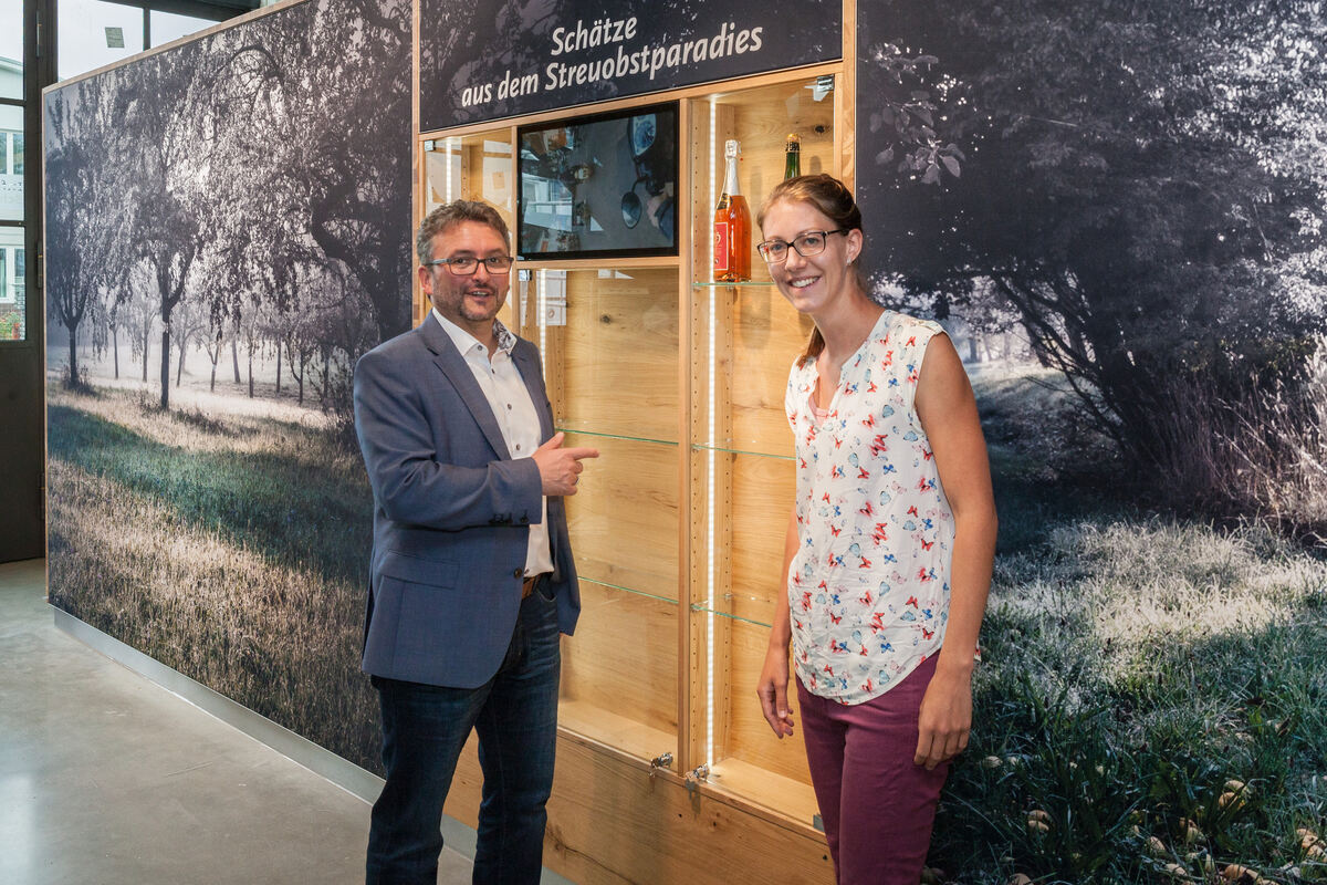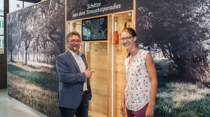 OB Michael Bulander freut sich zusammen mit Geschäftsführerin Maria Schropp: Bis zur Eröffnung ist die Vitrine mit »Schätzen aus dem Streuobstparadies« aufgefüllt. Das meiste gibt es bereits im Café Pausa nebenan. FOTO: ANGELA HAMMER