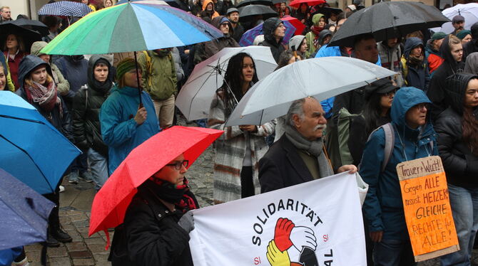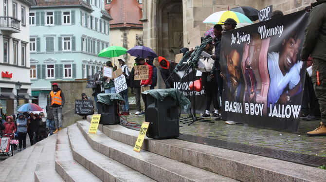 Gegen Ende der Veranstaltung zogen die Teilnehmer der Kundgebung vom Holzmarkt weiter zum Marktplatz vor das Rathaus. Dort, vor dem Amtssitz des Tübinger Oberbürgermeisters, hielten sie eine Schweigeminute für Basiru Jallow ab. Mit Blick in Richtung des Alten Botanischen Gartens. Dorthin, wo der junge Mann die letztlich tödlichen Stiche versetzt bekommen hatte. (GEA)