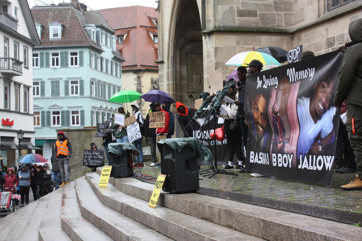 TÜBINGEN. Am Samstagvormittag kamen rund 600 Menschen zu einer Kundgebung auf dem Tübinger Holzmarkt zusammen. Sie erinnerten an den aus Gambia stammenden Basiru »B-Boy« Jallow, der letzte Woche im Alten Botanischen Garten mit einem Messer angegriffen worden war und an den Folgen seiner Verletzungen am selben Abend im Krankenhaus verstarb (wir berichteten).