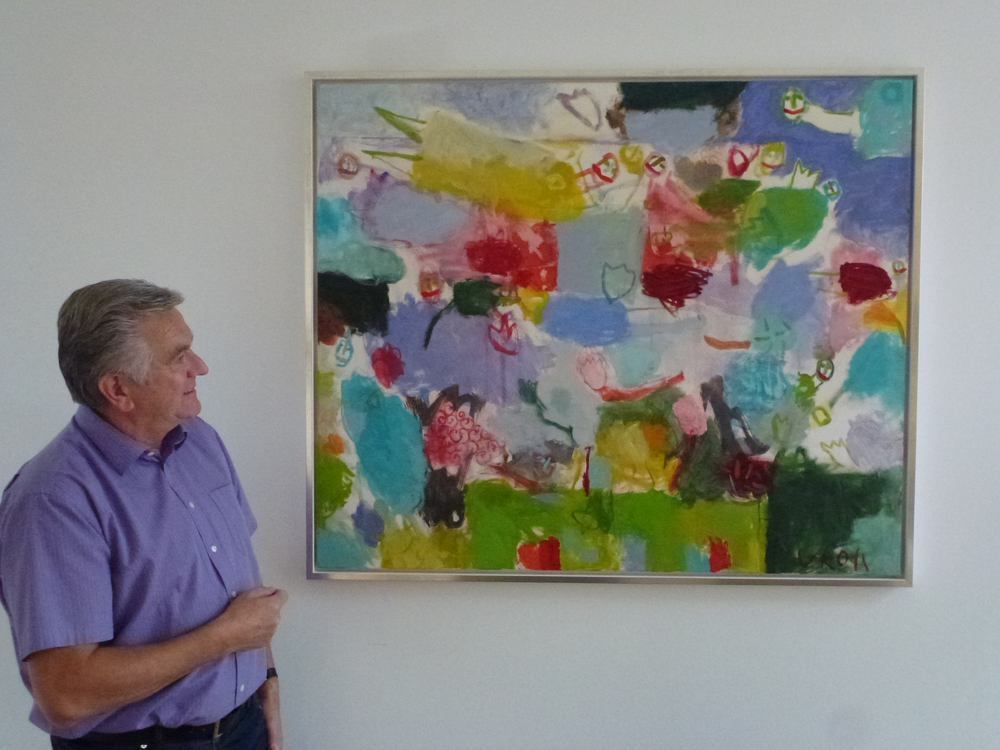 Kreisbau-Geschäftsführer Berthold Hartmann in seinem Büro vor einem Bild des Künstlers Paul Groll aus Lauchheim mit dem Titel »Kleiner Turmbau«.