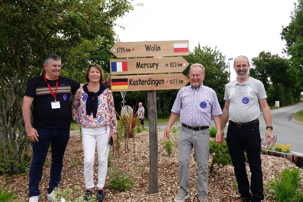 Als dritte Partnergemeinde von Venansault wurde Kusterdingen auch mit einem Hinweisschild bedacht. Von links: Laurent Favreau (Bürgermeister von Venansault), Chrystèle Chupeau und Erich Spannenberger von den jeweiligen Partnerschaftskomitees, und Kusterdingens Bürgermeister Jürgen Soltau.
