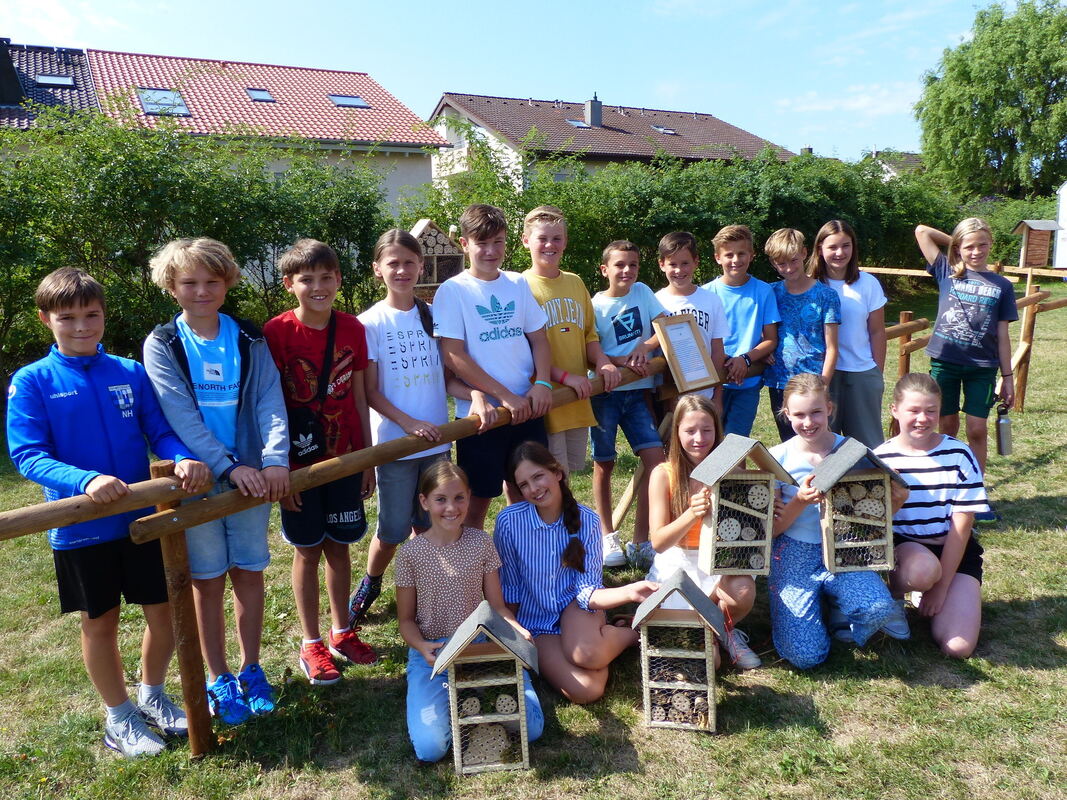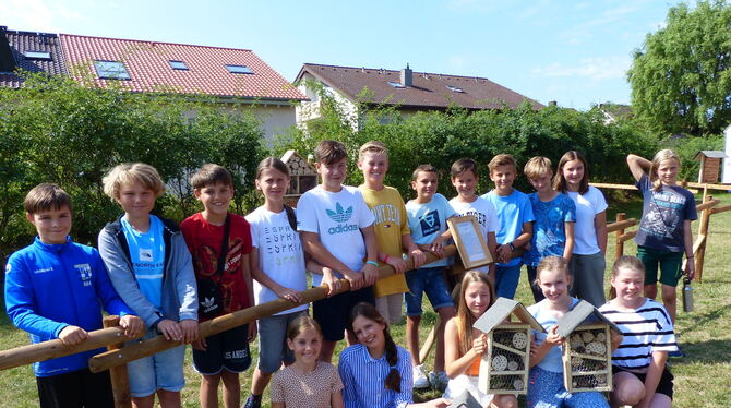Sechstklässler stehen auf der umzäunten Wiese, die künftig natürlich wachsen darf. Einige Schüler haben im Projekt »Lernen durch Engagement« Insektenhotels gebaut. FOTO: WEBER