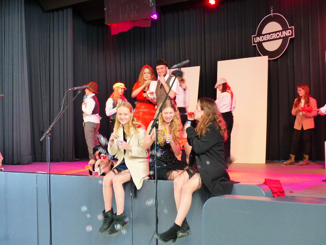 »Für mich ist die Message des Stücks, dass man auch die kleinen Dinge jeden Tag genießen soll«, sagt Neuntklässlerin Johanna Schneider, die eine Ärztin spielt und in einer zweiten Rolle in der Honolulu-Bar im Gefolge einer Mafia-Anführerin ist. »Das bringt Margarete Henri bei. Für ihn wird das Leben dadurch leichter.« Hauptdarsteller Johannes Thorsteinsson, der in diesem Jahr Abitur macht, findet in dem Stück mehrere Botschaften. »Auch wenn das Leben gerade schlecht läuft und unerträglich ist, kann es einen Wendepunkt geben und plötzlich kommt eine sehr, sehr schöne Seite hervor«, sagt er. Sehr überzeugend ist seine Darstellung des verzweifelten Henris am Anfang des Stücks und auch Antonia Schneider als Margarete gelingt es, die Zuschauer mitzunehmen.
