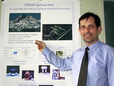 Tief im Felsmassiv des Gran Sasso (Plakat im Hintergrund) sucht auch der neu berufene Tübinger Experimental-Physiker Josef Jochum nach Neutrinos.