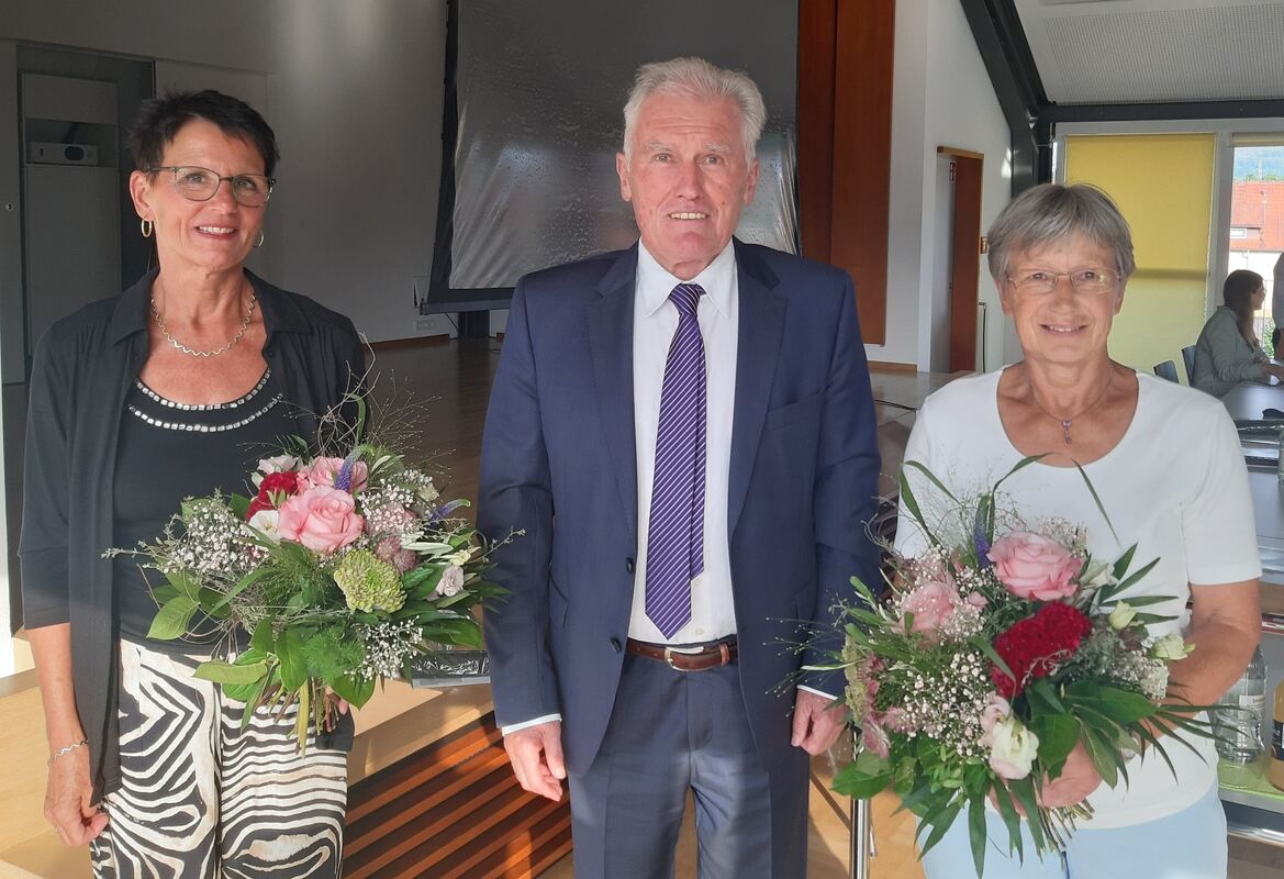 OFTERDINGEN. Zusammen bringen es die beiden auf 75 Jahre Dienst bei der Gemeinde Ofterdingen: In der Gemeinderatssitzung am Dienstag verabschiedete Bürgermeister Joseph Reichert (Bildmitte) die langjährigen Mitarbeiterinnen Elisabeth Jaensch-Zoller (links) und Waltraud Haas (rechts) mit Blumensträußen, Regenschirmen und Dankesschecks in den Ruhestand.