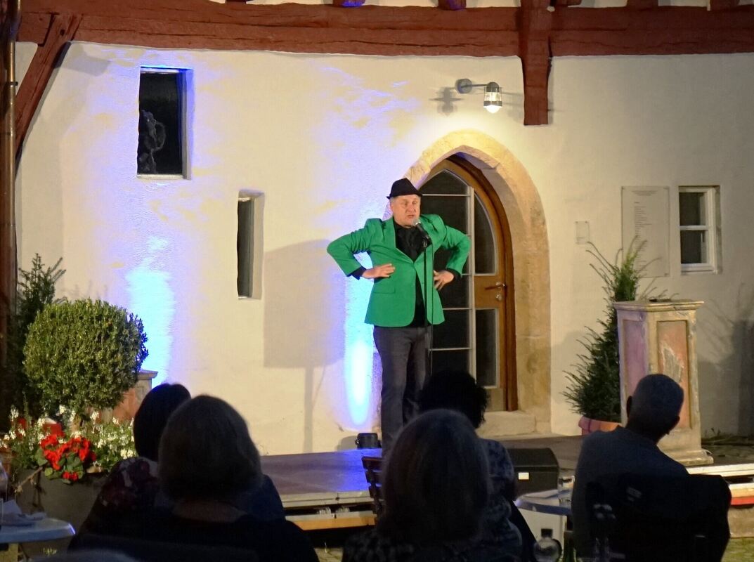 Bernd Kohlhepp tritt als Kulturschwabe Herr Hämmerle im Hof des Gomaringer Schlosses auf, bezieht Gäste mit ein und beantwortet später auch schlagfertig Fragen. FOTO: STRAUB