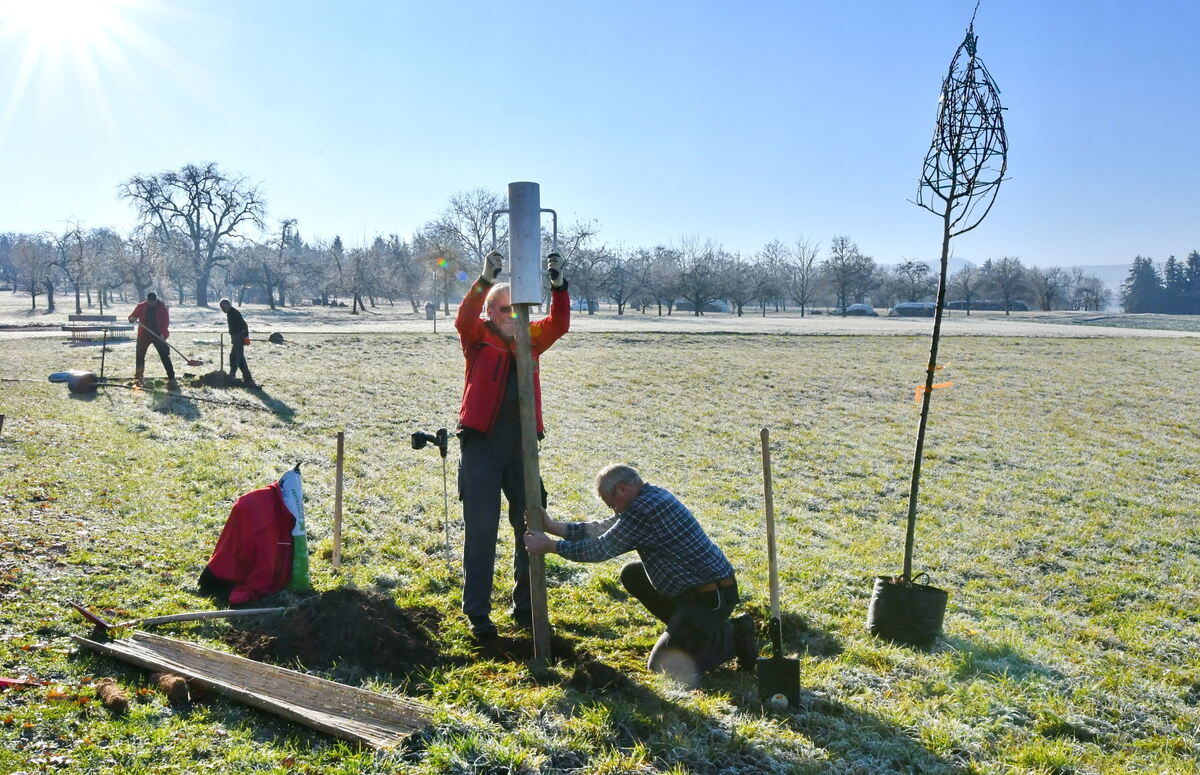 Künftig werden Bäume vor der Halle Schatten spenden. Zur Pflanzaktion der Bürgerstiftung am Samstag kamen 15 Helfer. FOTO: MEYER