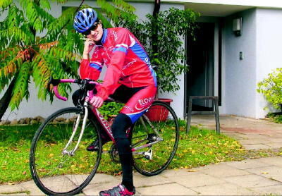 Junger Sportler in Denkerpose: Tobias Walz auf seiner Rennmaschine vor dem Internat des Mössinger Firstwald-Gymnasiums.