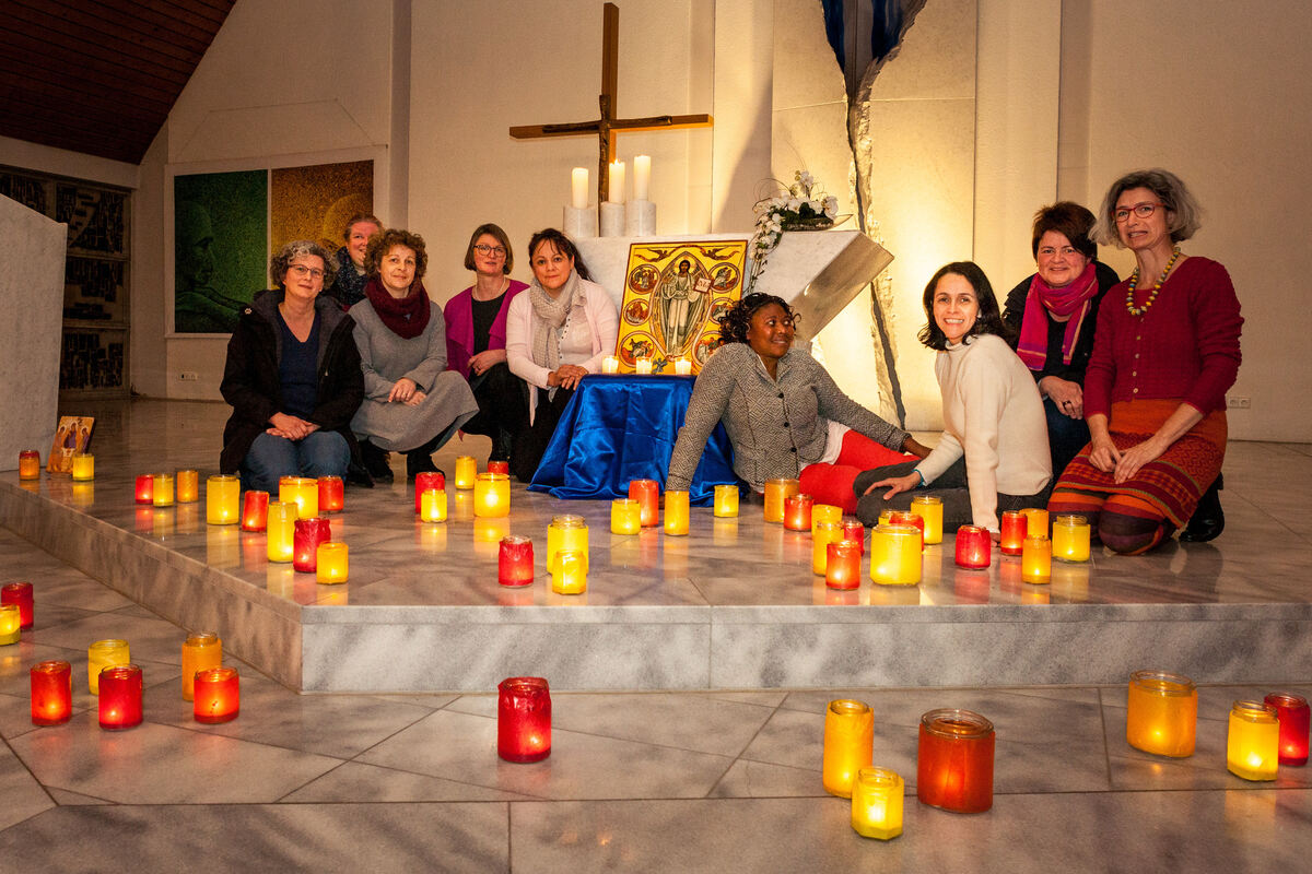 Die Lichtblick-Gruppe zwischen den Lichtern zum Taizé-Abendgebet. Vor dem Altar die Barmherzigkeits-Ikone von Taizé. FOTO: HAMMER