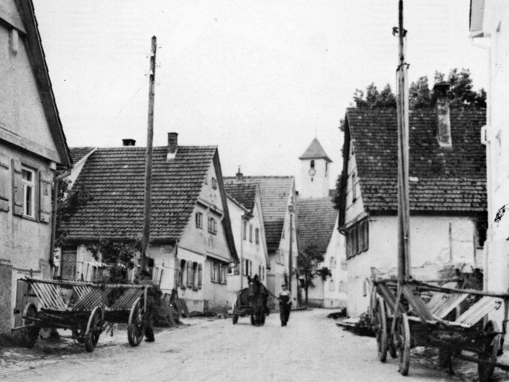 Die Bolbergstraße in einer alten Aufnahme. Die Häuser und der Turm sind verputzt. FOTO: DENKMALAMT