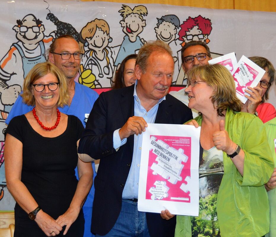 Verdi-Chef Frank Bsirske mit der Vorsitzenden Angela Hauser (links), Gerlinde Strasdeit (rechts) und weiteren Mitgliedern des Personalrats.