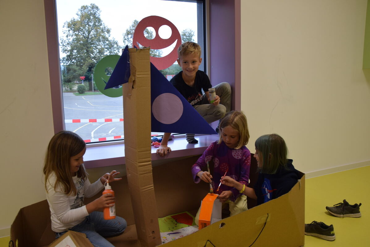 Auch der Flur des Neubaus mit seinen großen Fenstern lädt zum Spielen ein. Hier arbeiten Aliya, Leo, Isabel und Amelie (von links) gemeinsam an ihrem Schiff, das jeden Tag durch neue Details ergänzt wird. fotos: stöhr