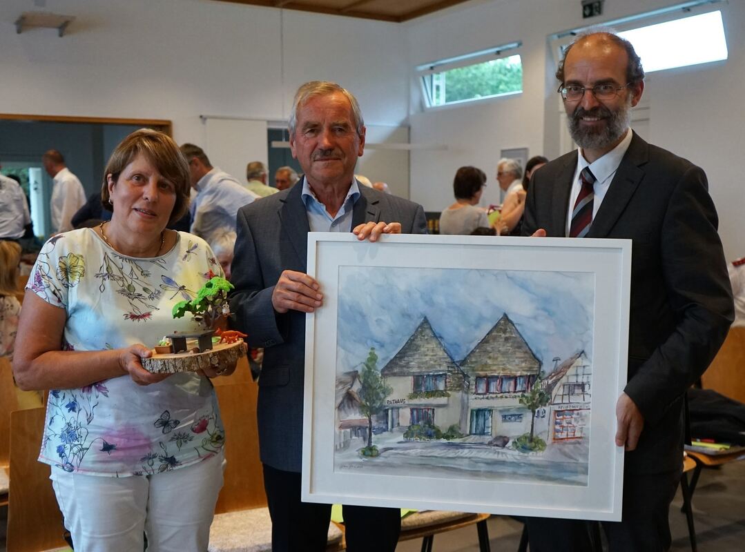 Marlene und Friedrich Braun erhalten von Bürgermeister Jürgen Soltau ein Bild des Rathauses, gemalt von der Reutlinger Künstlerin Hilde Franz. Foto: Straub