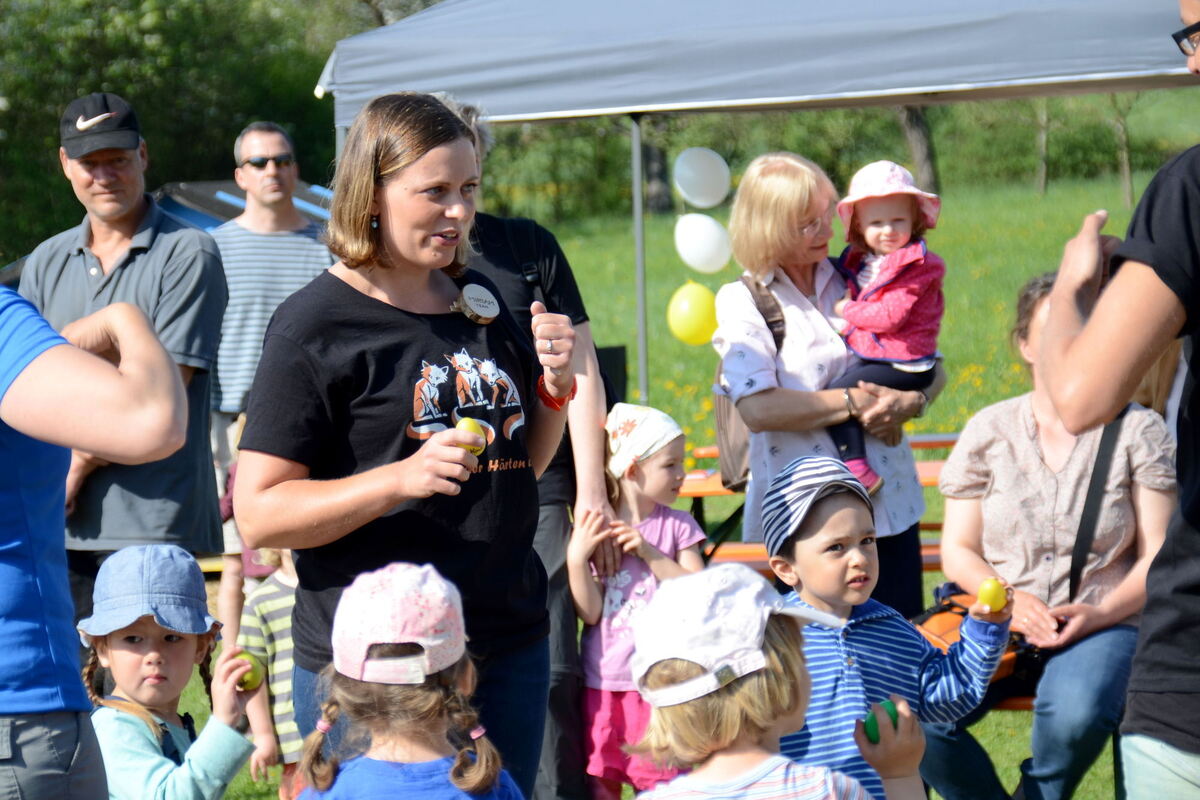 Miriam Barth gibt bei der Eröffnung des Waldkindergartens Mähringen den Ton an, singt und tanzt mit den Kindern. FOTO: EBER