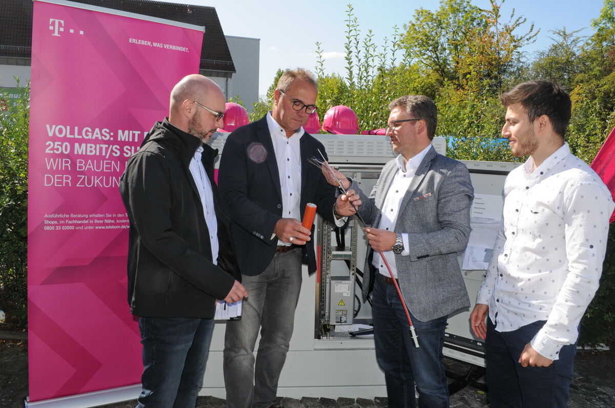 Telekom-Regiomanager Klaus Domscheit (Zweiter von links) erklärt Wirtschaftsförderer Claudius Mähler (links) und OB Michael Bulander den Aufbau einer Glasfaserleitung; rechts Telekom-Aufbauleiter Emre Sevenler vor einem der neuen Multifunktionsgehäuse.FOTO: MEYER