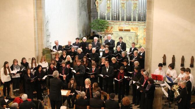 Die Mössinger Kantorei, das Mössinger Vokalensemble sowie der Jugendchor und das Blechbläserensemble der Jugendmusikschule musizieren gemeinsam unter der Leitung von Günther Löw. FOTO: BÜRCK