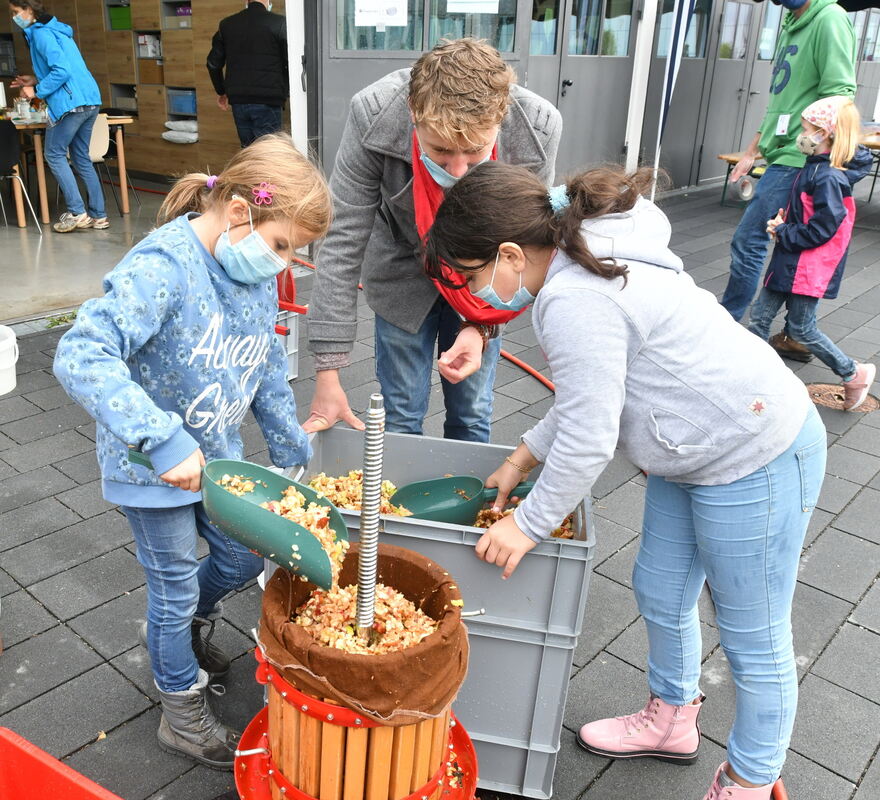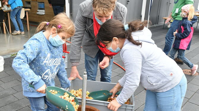 Begeistert bei der Sache: Kinder pressen bei der Mini-Veranstaltung des Mössinger Apfelfestes Saft aus Streuobst. FOTO: MEYER