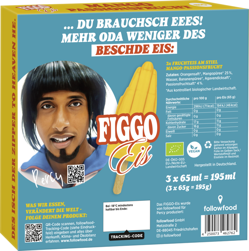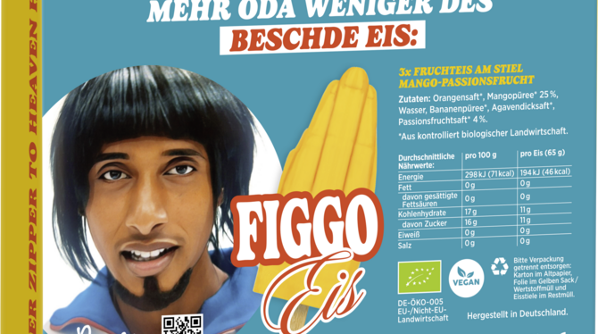 Ganz ohne Witz scheint Teclebrhan bei seinem Produkt das Thema Nachhaltigkeit am Herzen zu liegen. Als Percy weist er in seinem unnachahmlichen Stil darauf hin, dass nur Bio-Zutaten und kein raffinierter Zucker im veganen Mango-Passionsfrucht-Eis enthalten sind. Das wird in Zusammenarbeit mit Lebensmittelhändler Followfood in einem kleinen Betrieb in Konstanz am Bodensee hergestellt. Für Percy ist es damit »mehr oder weniger des beschde Eis«. Trotzdem bleibt abzuwarten, ob »Figgo« dem Flutschfinger den Rang als kultigstes Stil-Eis ablaufen kann. (GEA)