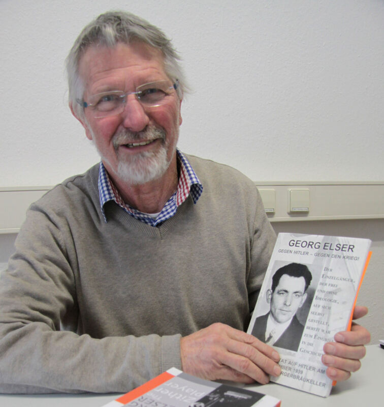 Gerhard Oberlader zeigt das auch von ihm verfasste Buch »Georg Elser – gegen Hitler, gegen den Krieg«. Der 68-Jährige führt als Fachmann durch eine Schau in Hechingen.