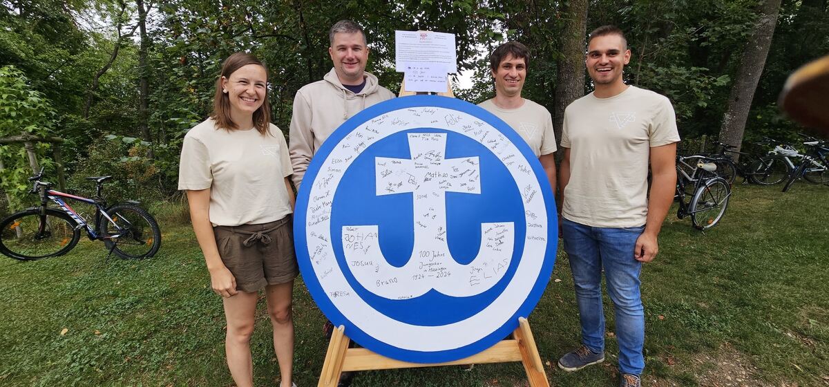 Das Ankerkreuz ist das Jungscharsymbol, darauf verewigten sich die Festgäste, der Vorstand hat das neue T-Shirt Jungscharlogo aufgedruckt: Die GPS-Koordinaten vom Aible und die Jahreszahl 1920, verbunden mit dem CVJM-Emblem. Drumherum stehen der Vorstand Theresa Strauß (von links), Manuel Laur, Matthias Haug, Florian Metzger. FOTO: JOCHEN