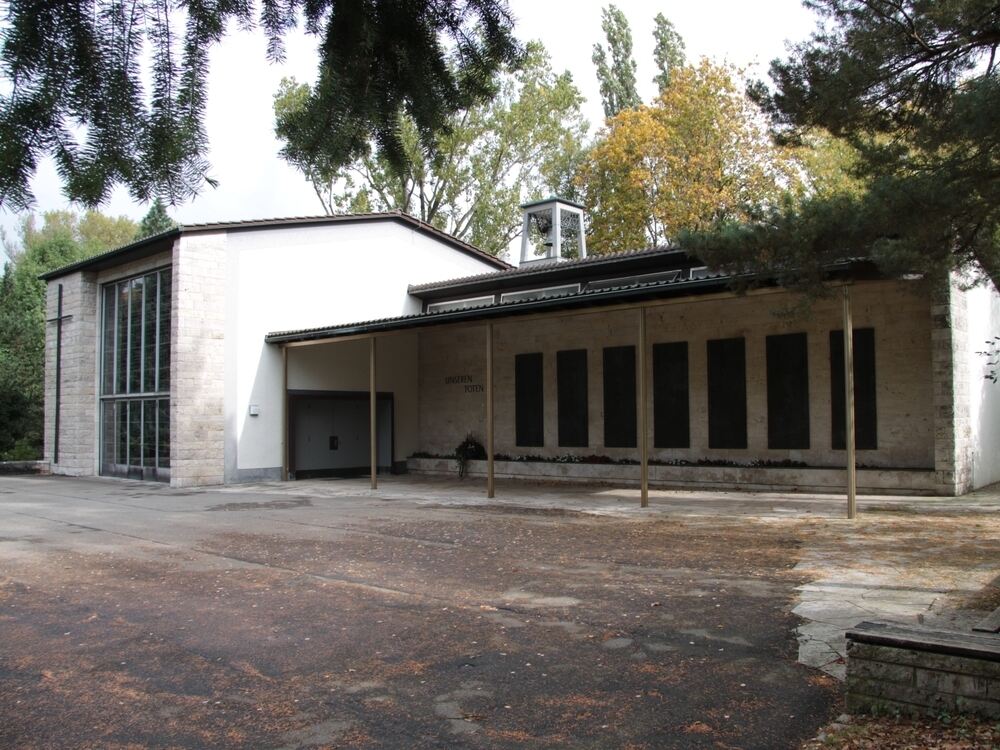 Die Aussegnungshalle auf dem Mössinger Friedhof wird innen umgebaut und saniert, der große Andachtsraum (linker Bauteil) bekommt seitlich ein weiteres Fenster.