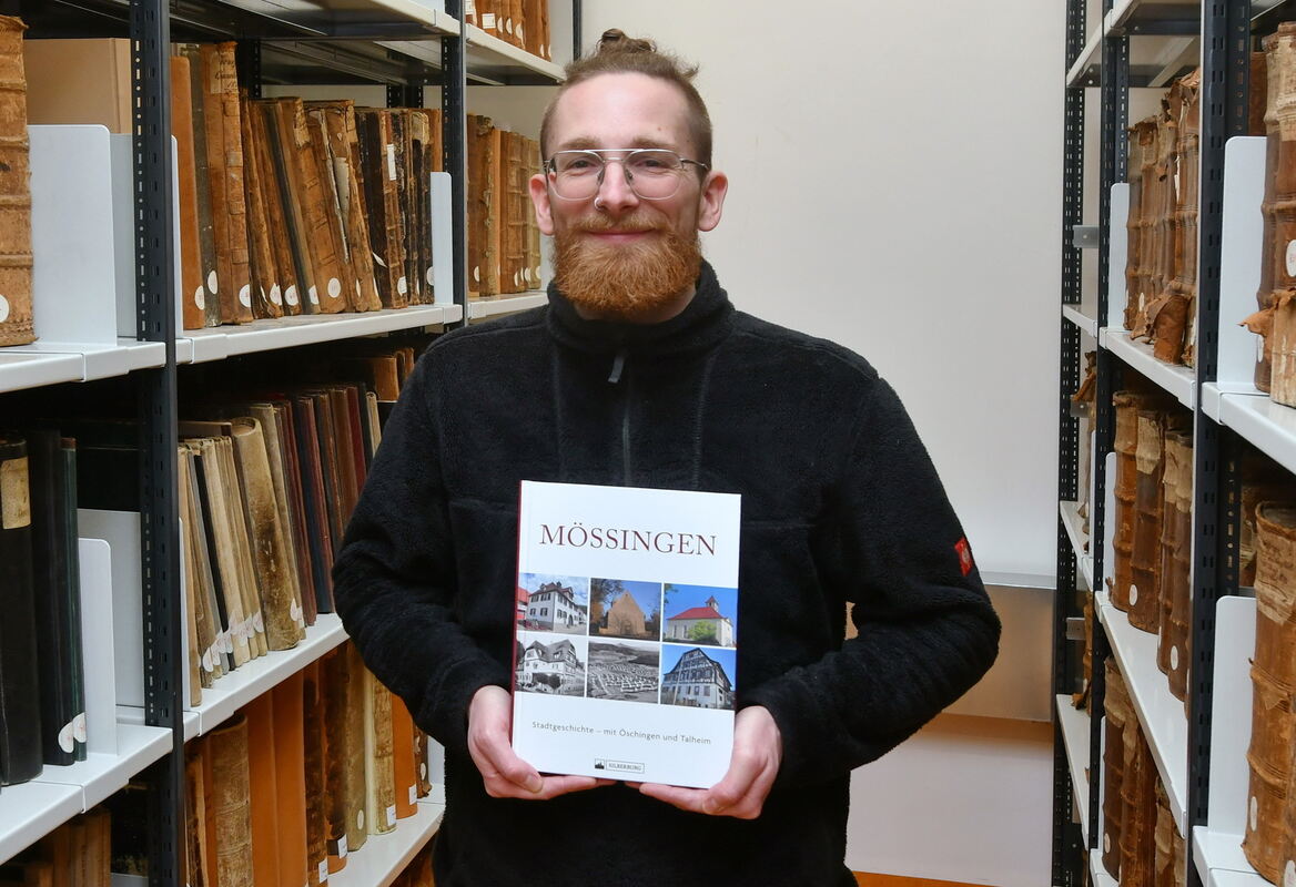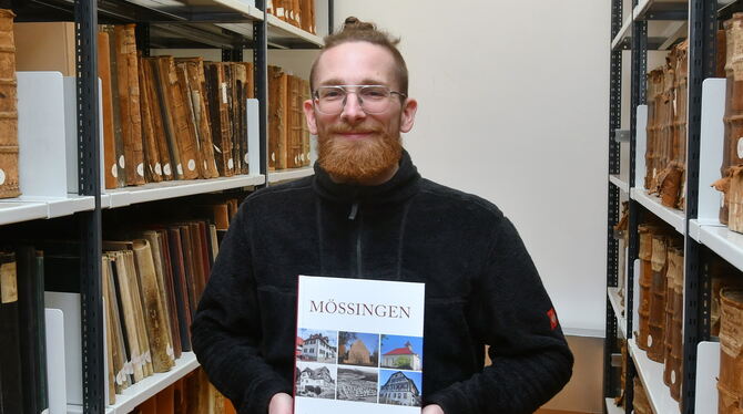 Stadtarchivar David Bauer mit dem neuen Mössinger Stadtgeschichtsbuch.