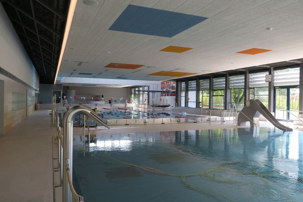 Die neuen Becken sind nun aus Edelstahl statt aus Kunststoff gefertigt. Komlett neu ist das zweigeteilte Kleinkindbecken mit Wasserspielen und Minirutsche. Der Umkleidebereich mit neuer Raumaufteilung und neuen Duschen schuf im hinteren Gebäudeeck Platz für den neuen Kleinkindbereich. Auch ein neues Dampfbad mit Farblicht im kleinen Wellnessbereich wird die Gäste künftig verwöhnen, zudem Erlebnisduschen und körpergeformte Wärmeliegen. Auf der Empore vor dem Schwimmerbecken finden Gruppen Sitzplätze, was nicht nur beim Schwimmunterricht und Training von Vereinen von Vorteil ist. Beheizte Sitzflächen schaffen nicht nur hier Komfort und setzen optisch Akzente. Die neue Akustikdecke macht alles ruhiger, die seitlichen Öffnungen in der Decke hoch in die Dachkonstruktion schaffen nach oben mehr Luft. (GEA)