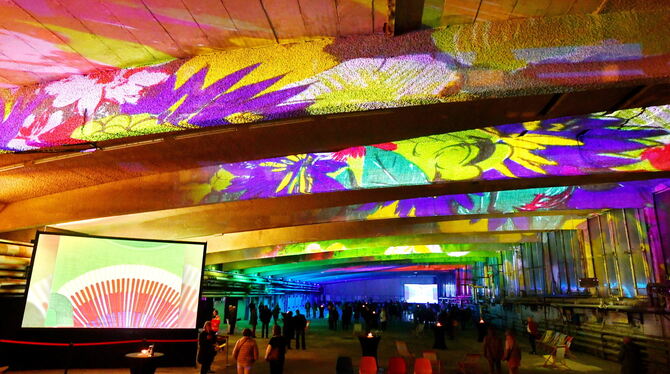 MÖSSINGEN. Bevor das doppelte Jubiläumsjahr am 31. Dezember mit einem gigantischen Feuerwerk enden wird, hat die Stadt mit einer spektakulären Lichtshow abermals ein Highlight gesetzt. Am Wochenende wurde die denkmalgeschützte Pausa-Bogenhalle an drei Abenden mit einer »Traum.Stoff-Lichtprojektion« in Szene gesetzt. So bunt ging es in der ehemaligen Ausrüstung der Textilfirma seit deren Schließung vor zwanzig Jahren nicht mehr zu, sagte Oberbürgermeister Michael Bulander am Freitagabend vor einer Hundertschaft Gäste. Darunter dem letzten lebenden großen Textildesigner der 1960er Jahre, dem bald 90-jährigen Grafiker Andreas Felger. Seit 1957 neben dem Verwaltungsgebäude Stoffe für die Bedruckung vorbereitet worden waren und letzte Woche der jährliche »Kulturherbst« des Theaters »Lindenhof« mal wieder zu Ende gegangen ist, erstrahlte die herausragende Lehmbruck-Architektur nicht mehr in solch einer Farbenpracht.