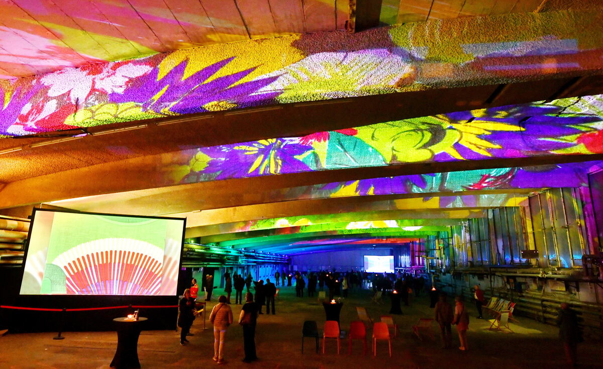 An Farben hatte es der Pausa in ihrer 80-jährigen Firmengeschichte nie gemangelt. »Die Textilsammlung der Stadt umfasst 88.000 Musterdessins und Tausende von Entwürfen. Ein ausgewählter Bruchteil davon ist nun für diese außergewöhnliche Schau von Mustern mit Musik ausgewählt worden.« Mit Beamern, Strahlern und durch melodiöse Töne untermalt wurden auf die markanten Deckenbögen der Bogenhalle Stoffmuster aus der Pausa-Textilsammlung projiziert. »Wir haben 350 Stoffdesigns ausgesucht, die einen Querschnitt der namhaften Künstler und der modischen Epochen widerspiegeln«, so Museumsleiterin Franziska Blum.