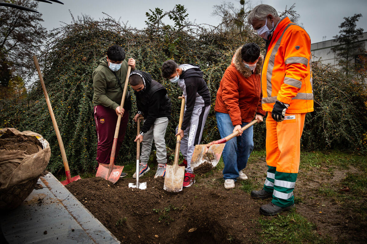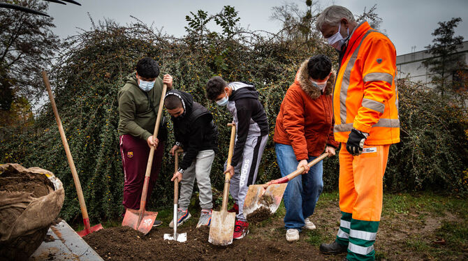 MÖSSINGEN. »Yallah, schnell, komm her, komm«, ruft der 14-jährige Diari seinem Mitschüler Muhamed (13) zu. Dann greifen die beiden Jungs zur Schaufel. Schnaufend schütten sie das Erdloch rund um den jungen Baum zu, den sie gerade zusammen mit Stadtmitarbeitern neben ihrem Schulgebäude eingepflanzt haben. Diari und Muhamed gehören zu den Schülerinnen und Schülern der Steinlachschule Mössingen, die sich aktuell an der Umweltschutzaktion »cleanup!moessingen« beteiligen. Alle Mössinger Schulen machen bei dem Projekt mit. Die Idee: Schüler der Schulen sammeln jeden Freitag im Monat Müll in verschiedenen Stadtgebieten ein, um die Umwelt zu entlasten. Die Stadt spendet dafür jeder Schule einen jungen Baum, um der Umwelt etwas zurückzugeben.