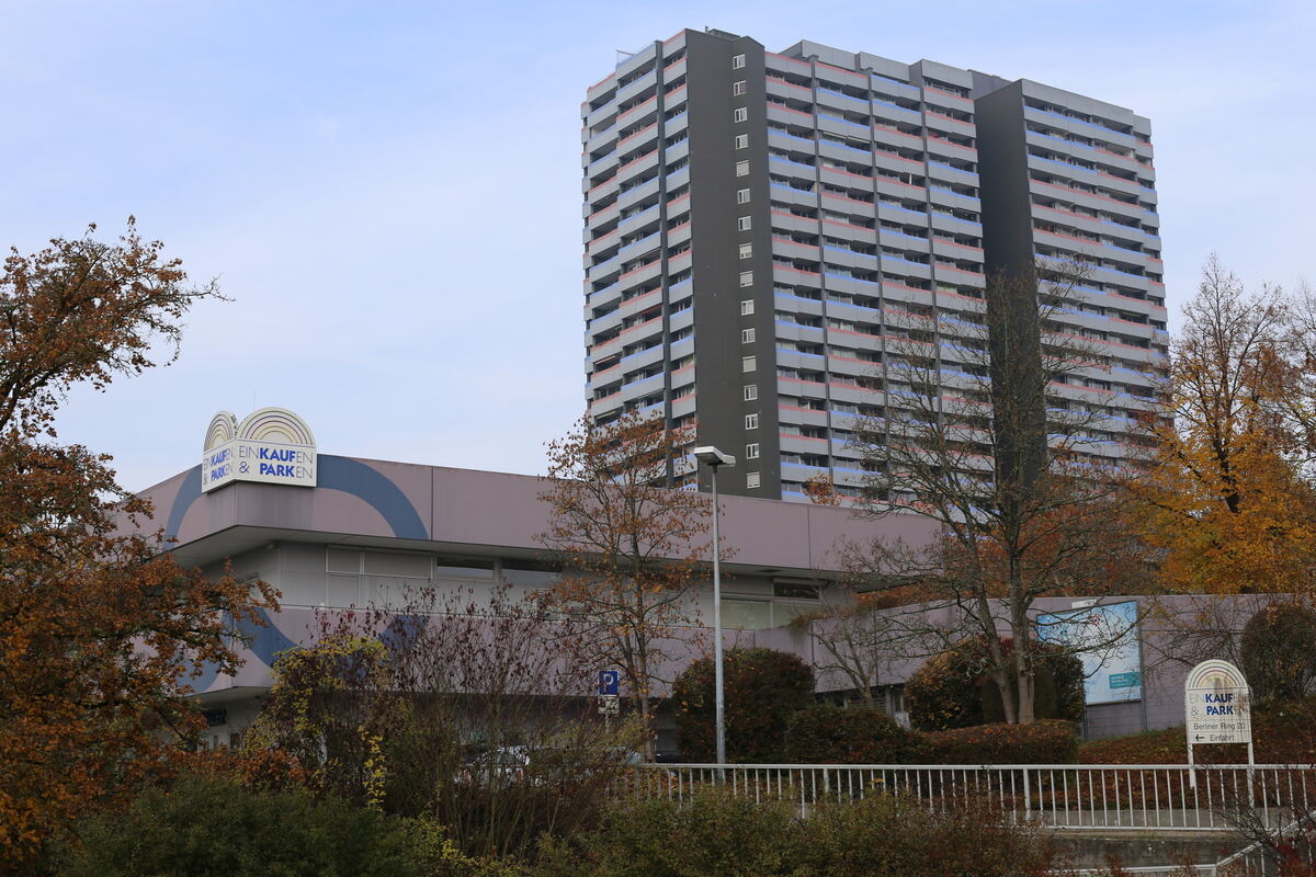 Breite Straßen, Fußgängerbrücken darüber, viel Beton, wuchtige Gebäudekomplexe, Hochhausriesen: Städtebaulicher Eindruck am Berliner Ring in Waldhäuser-Ost inTübingen.