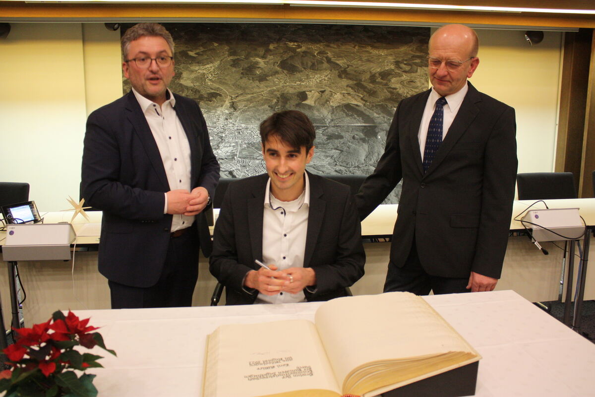 Am Mittwoch trug sich Toni Kittler ins Goldene Buch der Stadt Mössingen ein. Oberbürgermeister Michael Bulander (links) und Ulrik Beutter, Vorsitzender des Mössinger Flugsportvereins, schauten ihm dabei über die Schulter.