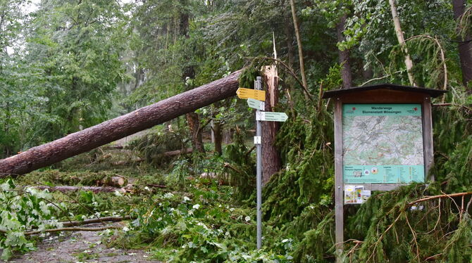 MÖSSINGEN. Mössingen kämpft immer noch mit den Folgen des starken Gewitters. Starkregen und Windböen hatten am Donnerstagabend voriger Woche zu erheblichen Schäden geführt (wir berichteten). »Vielerorts sind Bäume gebrochen und umgeworfen worden, Gipfel wurden gekappt«, schreibt die Stadtverwaltung. Selbst starke Äste brachen ab.
