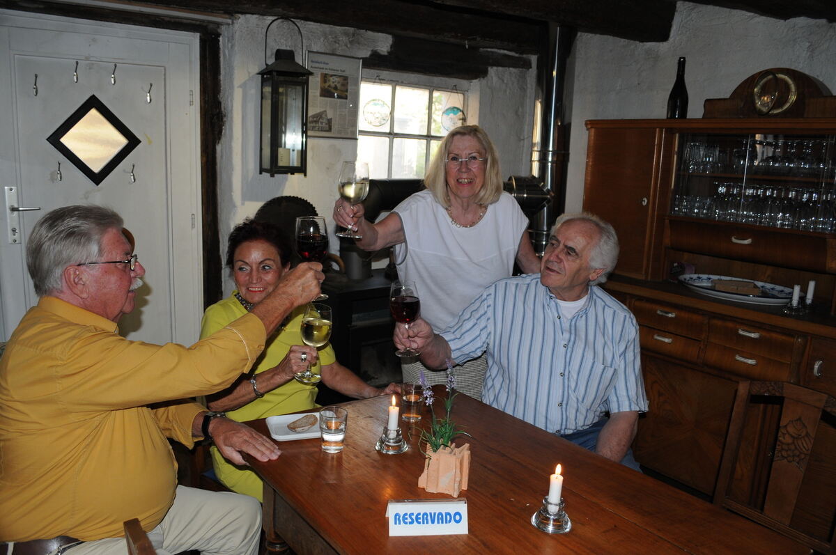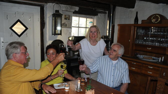Hanne Bohn mit den drei Gründungsstammtischlern in der Weinstube im alten Stall in Mössingen, die nach sieben Jahren zum Jahresende aufgegeben wird, da Bohn in den offenen Gasträumen eine altersgerechte, barrierefreie Wohnung einbauen lässt. FOTO: MEYER
