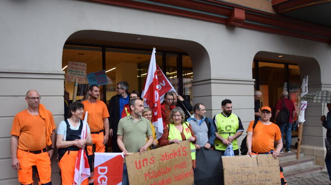 TÜBINGEN. Mit Spruchbändern und Transparenten haben am Montagnachmittag Betroffene und Vertreter der Gewerkschaften vor dem Rathaus protestiert. Anlass war die mögliche Rückgabe der Müllabfuhr an den Landkreis.