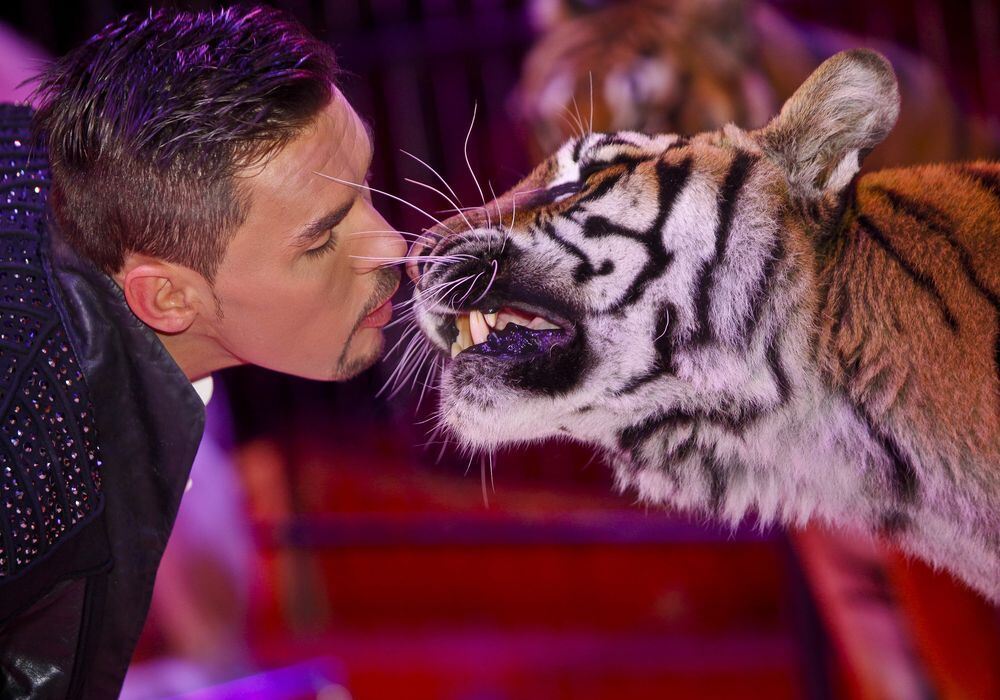 Tom Dieck jun. tritt mit einer gemischten Raubtiergruppe auf, zu der auch fünf Bengal-Königstiger gehören. FOTO: ZIRKUS CHARLES KNIE