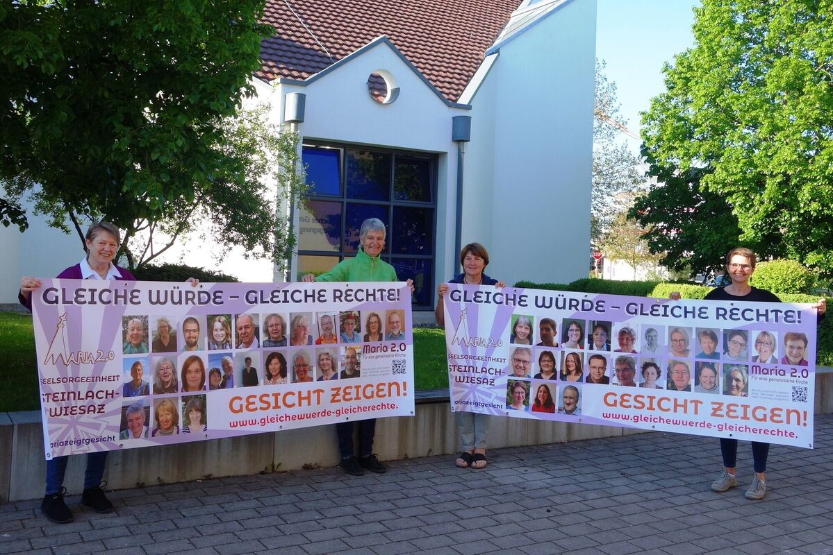 Pastoralreferentin Bärbel Kannwischer, Eva-Maria Ferber, Angelika Mager und Kristine Schmidt mit dem neuen Banner, mit denen Maria 2.0 Unterstützer ihr Gesicht zeigen. FOTO: STRAUB