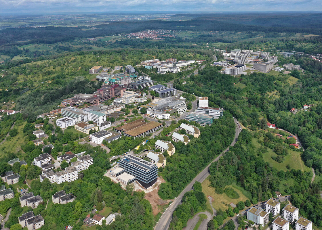 Das Uniklinikum Tübingen auf dem Schnarrenberg entwickelt sich stetig weiter. Das Forschungsinstitut »M3« im Vordergrund soll dieses Jahr fertig werden. LUFTBILD: MANFRED GROHE