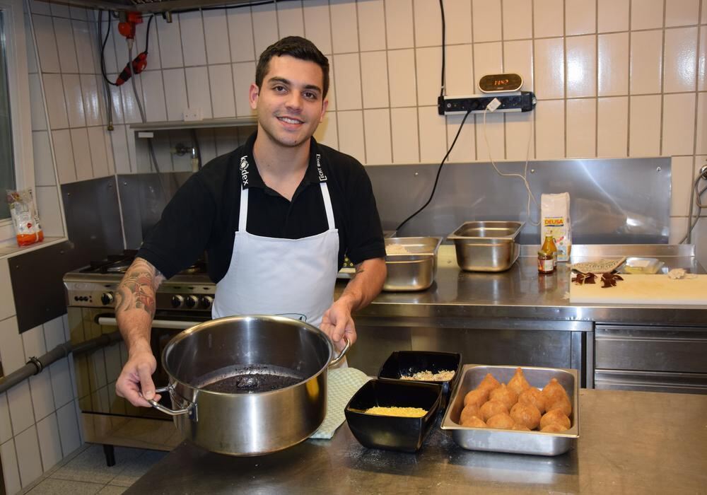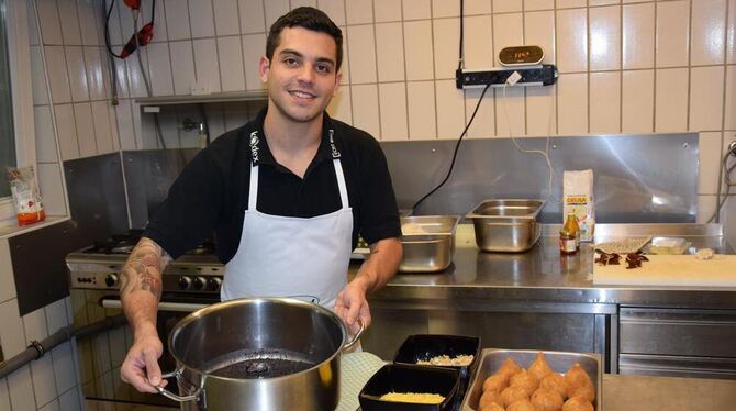 Der junge Spitzenkoch am Ort seines Könnens: Valtuir Tolotti Mezzomo lernt in der Öschinger Biometzgerei Grießhaber, wie Wurst gemacht wird. FOTO: JAENSCH