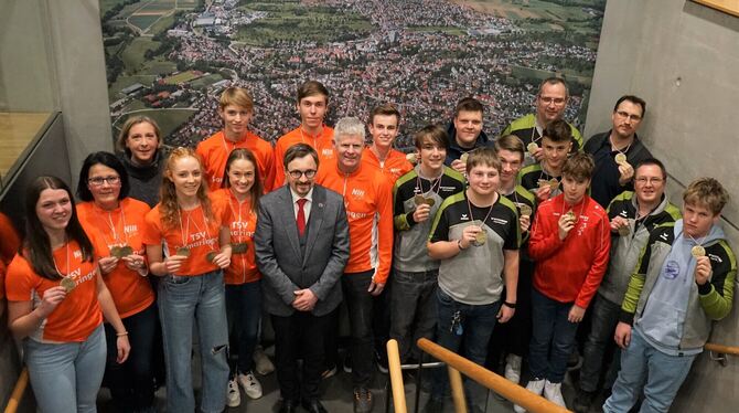 Die geehrten Sportlerinnen und Sportler zeigen stolz ihre Medaillen auf der Rathaustreppe. FOTO: STRAUB