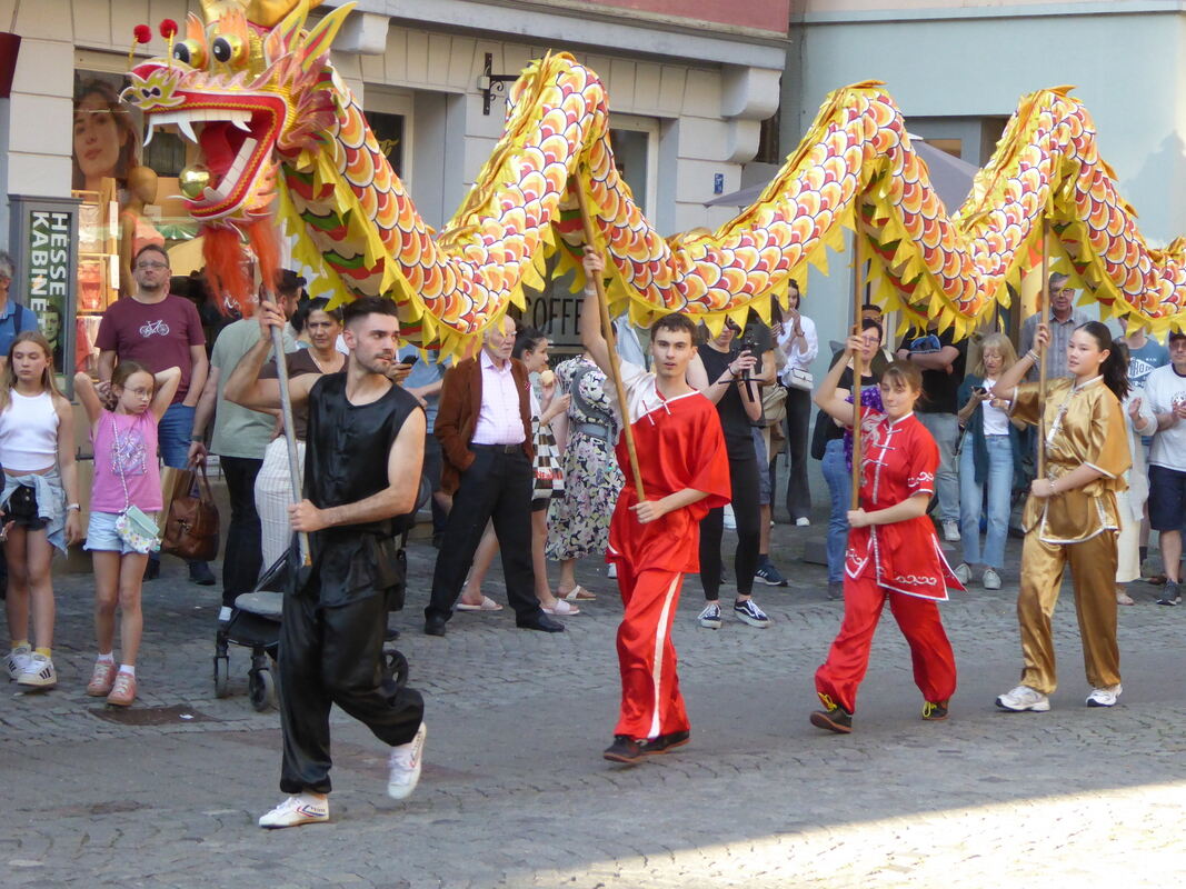 Drachen gucken. Die Zhuo Shi Wu Shu Akademie Tübingen zeigt mit Groß und Klein ihr Können. Die Kleinsten führen Wu Shu vor, das Kung Fu für Kinder. Mit Stöcken und ihrer Stimme bewaffnet, allein oder in Gruppen, mal mit atemberaubenden Sprüngen, mal tief auf dem Boden, beeindrucken sie das Publikum. Tai Chi und Qi Gong präsentieren die Erwachsenen - in weißen Gewändern und mit Fächer und Schwertern bewaffnet.