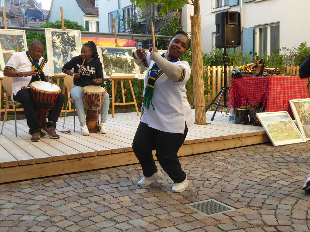 Sonnenstrahlen für besseren Klang. Im Innenhof der Stadtbücherei haben sich Ashanuru Malanga und Beno Chuwa aus Moshi in Tansania aufgestellt. Mit der Stadt am Kilimanjaro besteht seit zehn Jahren eine Städtepartnerschaft. Mitgebracht haben die beiden Kunst in Form von Bildern, Tüchern, Figuren und das Highlight: Gesang und Tanz. Ihre Trommeln haben sie den Tag über extra in der Sonne stehen lassen, damit der Sound besser ist. Sie führen mehrere Lieder aus ihrer Region vor und laden zum Mittanzen. Die Lieder werden traditionell in Zeremonien rund um die Ernte gespielt.