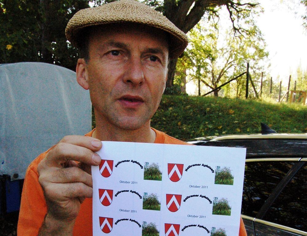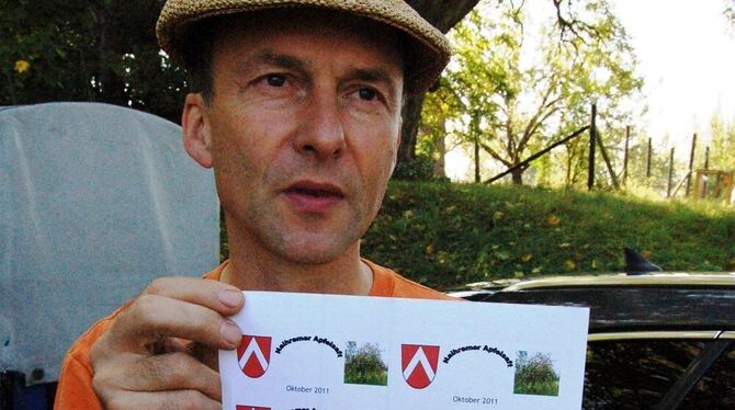 Wer reichlich Streuobst hat, kann dieses lokal verwerten und veredeln. Dazu gibt es mittlerweile vielerorts in der Region Projekte. Auch der kleine Ort Nehren hat seinen eigenen Apfelsaft: Martin Schurr von der Agendagruppe zeigt hier mit Stolz das lokale Etikett.