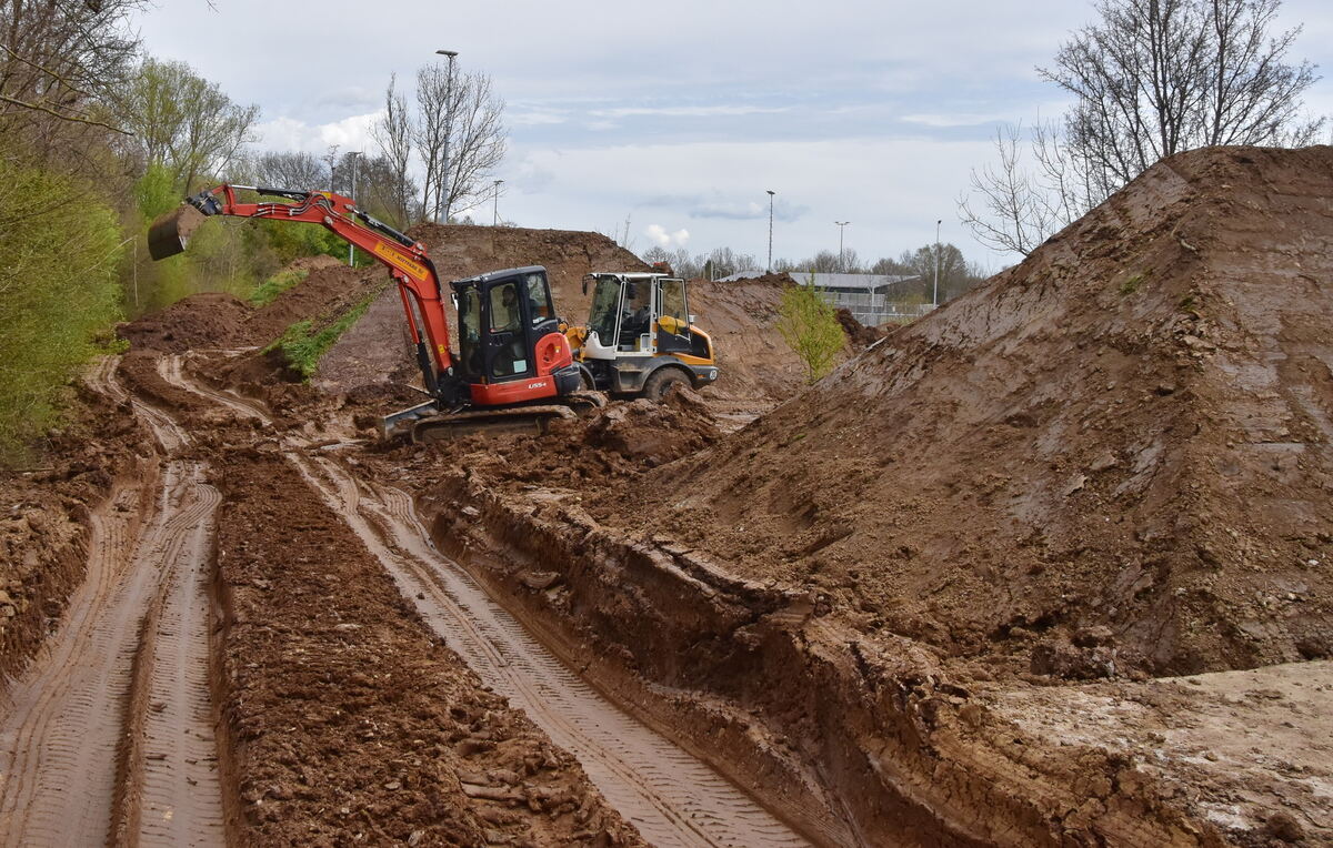 Baubeginn am neuen Dirtbike-Park in Belsen. Zum Event des zehnten Mountainbike- & Musikfestivals am ersten Wochenende im Juli soll er fertig sein. FOTO: MEYER