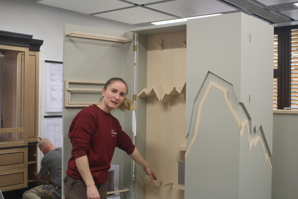 Meisterstücke: Annika Schwenk vor ihrem Kletterschrank. Im Hintergrund bereitet Pierre Stollmann seinen Schrank mit integriertem Terrarium auf die Abnahme vor.