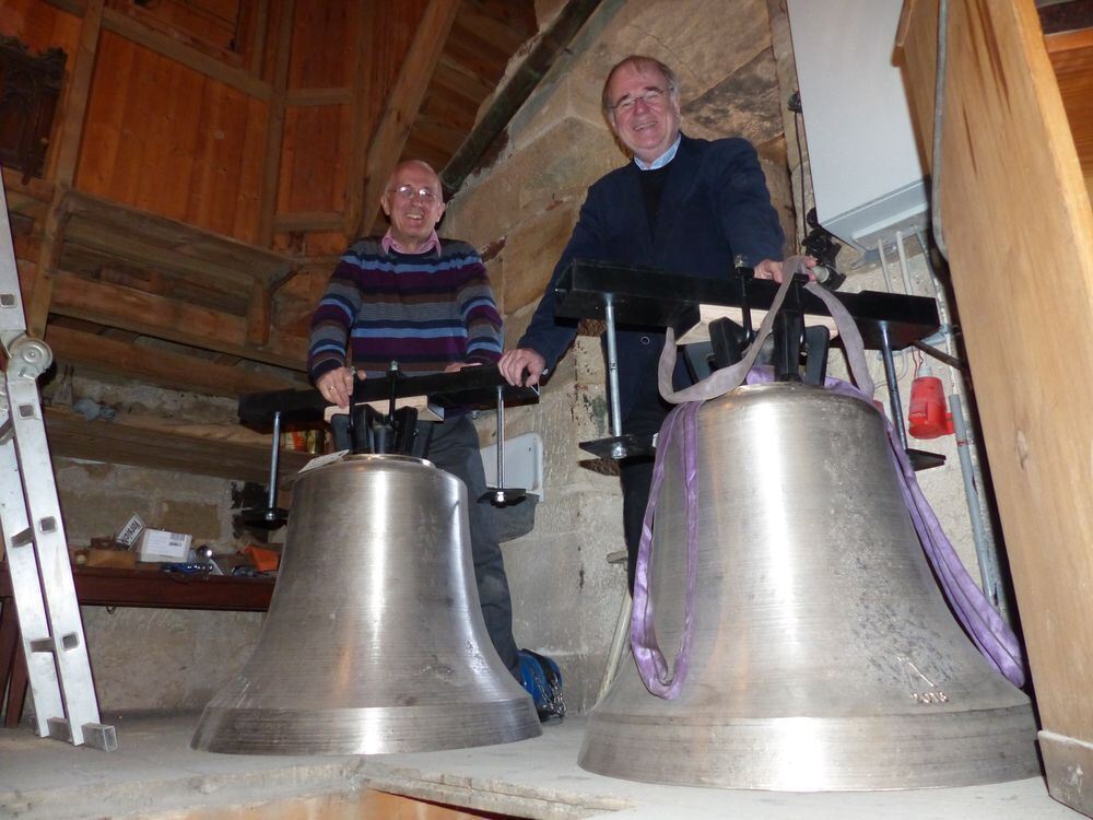 »Wie ein großes Instrument«: Organist Hans-Peter Braun (links) und Pfarrer Karl Theodor Kleinknecht mit den beiden neu gegossenen Klangkörpern. FOTO: STEINLE