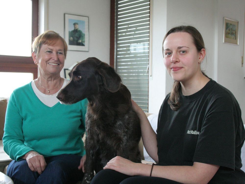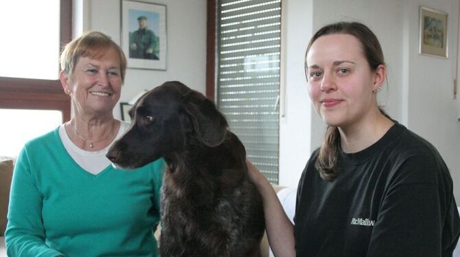 Zusammenleben mit Hund: Sieglinde Lohmüller und Karin Bihler haben sich im Projekt »Wohnen mit Hilfe« gefunden. Die Studentin hütet Hund Jeff, wenn Sieglinde Lohmüller keine Zeit hat. Dafür gibt es Mietnachlass für das Studentenzimmer. GEA-FOTO: WALDERICH