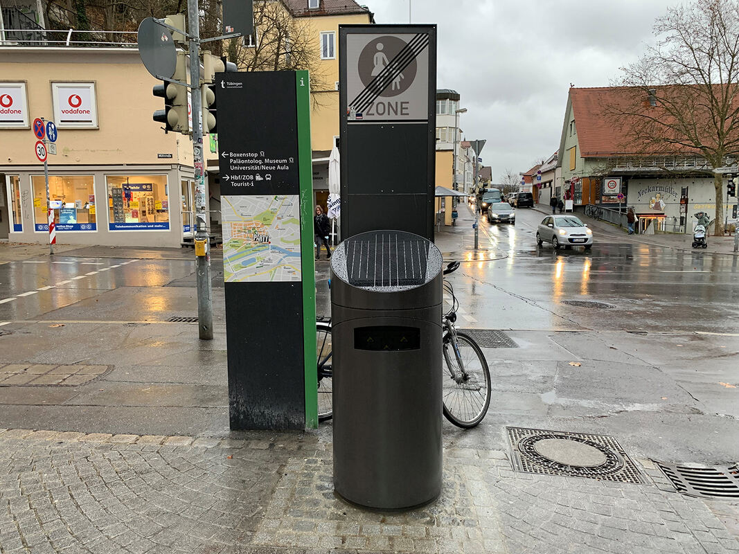 TÜBINGEN. In der Neckargasse an der Einmündung zur Mühlstraße steht nun ein »Solarhai«. Das ist ein Mülleimer, der den eingeworfenen Leichtmüll regelmäßig zusammenpresst. Die Presse funktioniert über einen Elektromotor, der über einen Akku gespeist wird. Ein Solarpanel auf der Oberfläche des Mülleimers lädt den Akku.